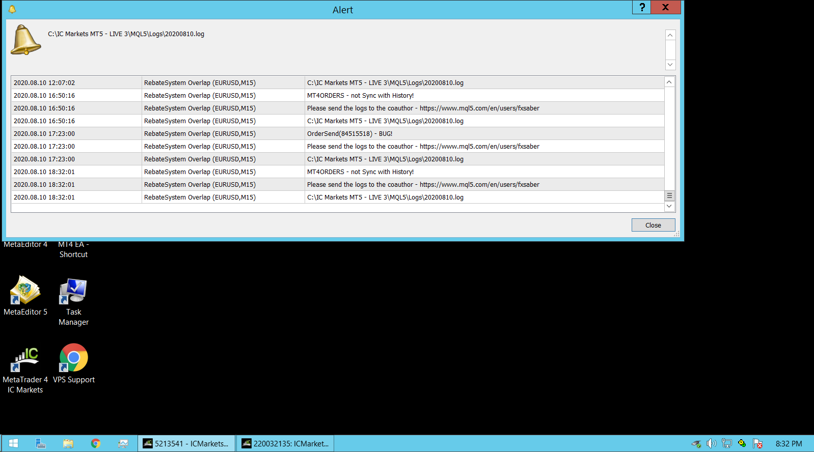Send me the full logs to sort it out: File -> Open data folder -> "MQL5\Logs\20201006.log" and "logs\ 20201006.log"