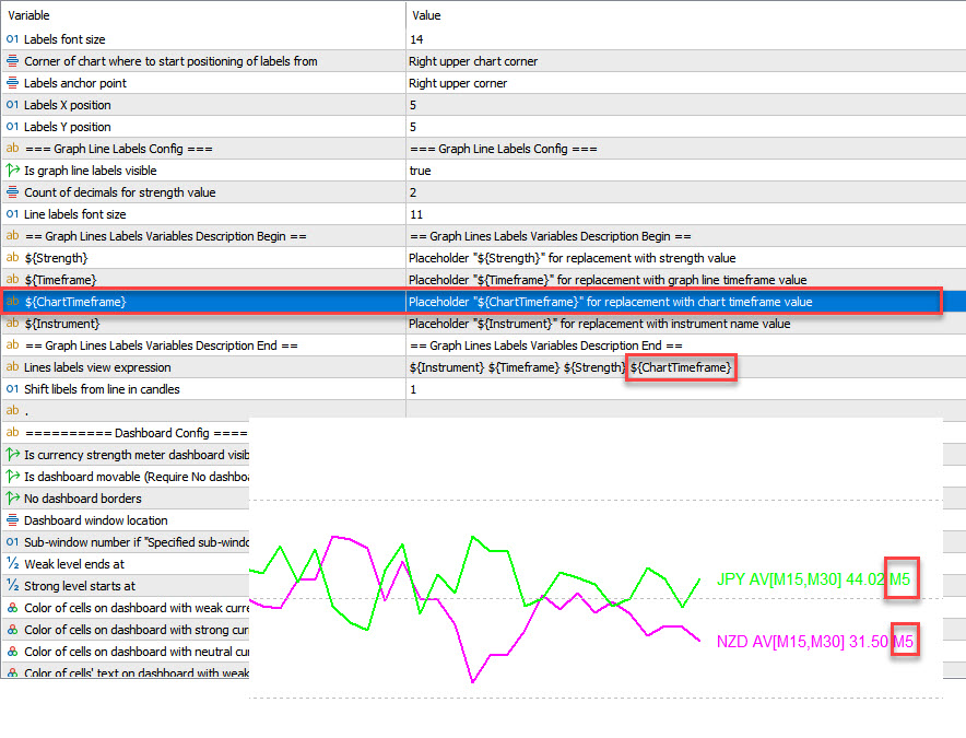 "Current:[Current]" expression means: for current chart timeframe show strength which would be calculated on the same timeframe;