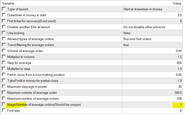 The variable “MagicNumber of medium orders (must be unique)” is the identifier of the averaging orders of the AW Recovery Expert Advisor itself.