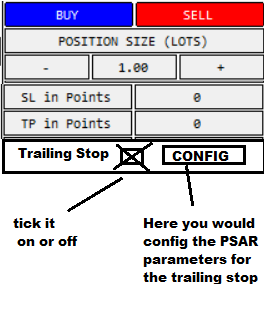 I wanted a small window on the corner of the chart just with a buy/sell buttons, then the fields to put lot, stop loss and take profit sizes. Perhaps a trailing stop function based on PSAR parameters.