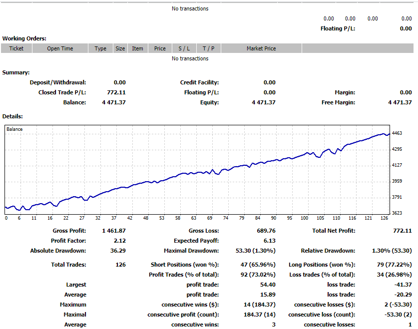 The Ea already tuned and ready to trading, just set it on EURUSD H1 pair and select suitable trading lot.