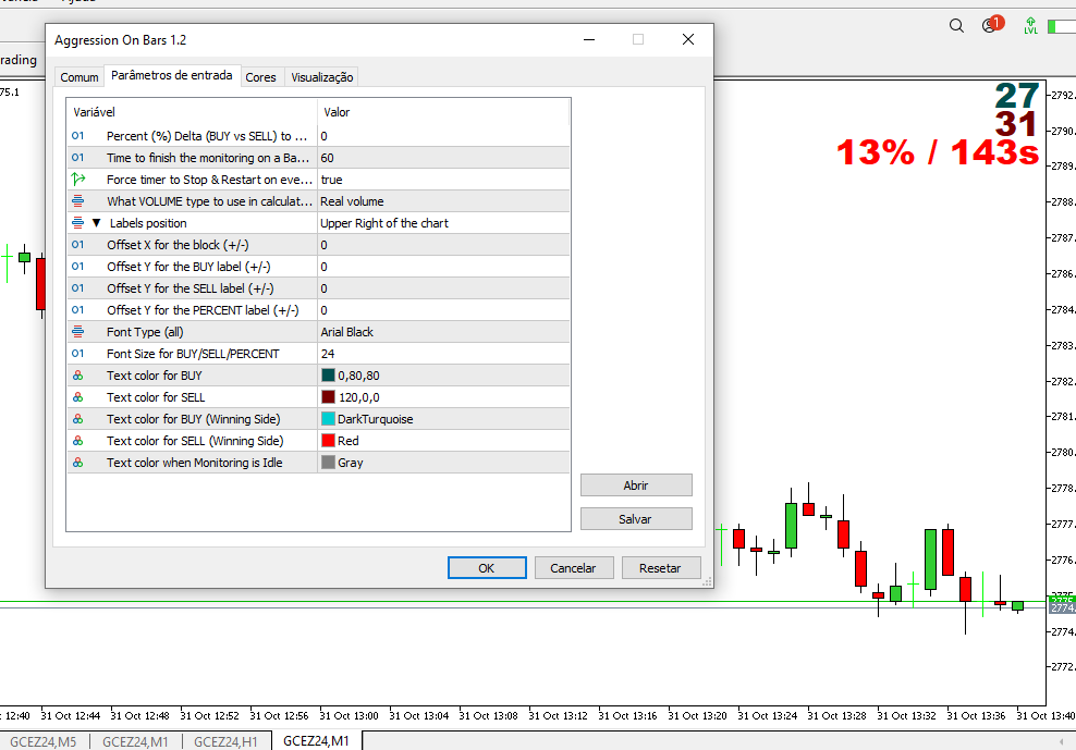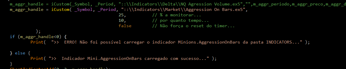 Captain Flavio! obrigado pela resposta. Coloque esta sugestao no diario de bordo :-) ,um valor de maximo e minimo em um intervalo de tempo programavel, creio que nao pesaria muito( nao geraria o grafico). Por exemplo, ultimos dez segundos , max agressao de 52% p compra, min de 30%, e venda max de 30% , venda min 5%.Algo assim ou melhor ja daria mais consistencia nas decisoes em volatilidade muito alta e valorizaria em muito o indicador.
