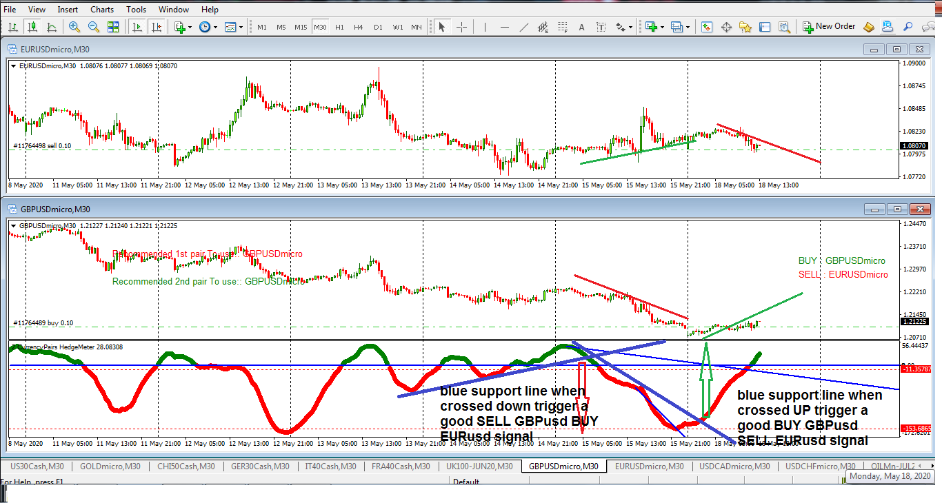* use the line indicator colors Red and Green Crossing Level 0 : Red means you Sell 1st settled pair and Buy 2nd - Green means you Buy 1st settled pair and Sell 2nd
