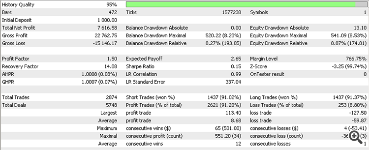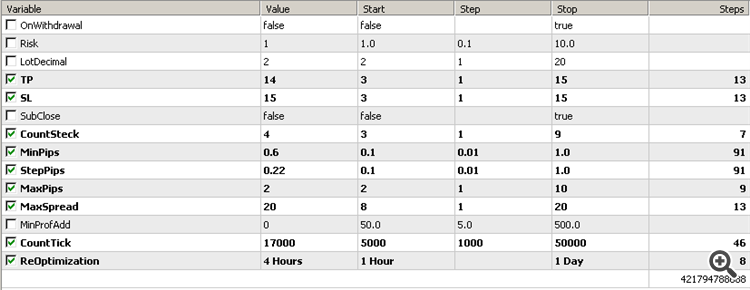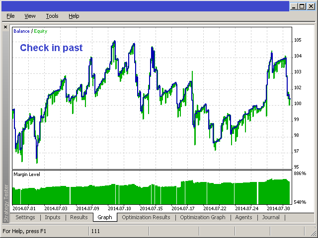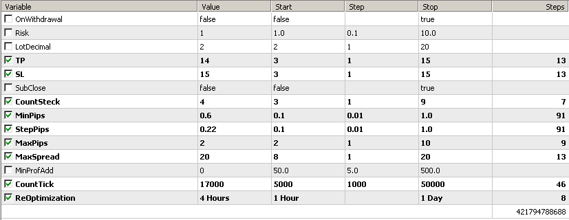 Нужно помнить что это тиковый скальпель, соответственно задержки имеют большое значение. Имея настройки которое проходит с задержками, оно может показать каждый раз разные результаты. Хорошо видно что эксперт делает много позиций, соответственно можно хорошо заработать на спрэде. Оптимизация, оптимизация прервана очень быстро (2014.08.01 - 2014.09.01 "file0.png") Проверка в будущее (2014.09.01 - 2014.09.13 - сегодня "file1.png") Проверка в прошлое (2014.07.01 - 2014.08.01 "file-1.png") Проверка в далекое прошлое (2014.01.01 - 2014.08.01 "file-2.png") Начальный депозит 100 $, счет демо ECN на Робофорекс, настройки необходимо проверять именно для этого счета (testset.set), файл с отчетом короткой оптимизации (ReportOptimizer.xml).