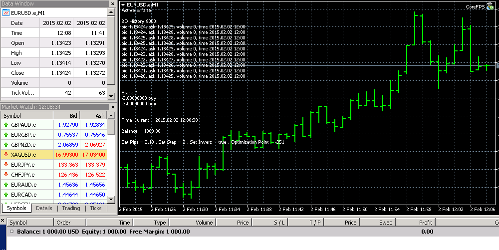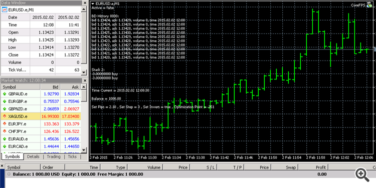 It must be remembered that it ticks scalpel, according delays are important. With that set-up is delayed, it may show different results each time. It is clear that the expert makes a lot of positions, respectively, you can make good money on the spread. Optimization, optimization fail very quickly (2014.08.01 - 2014.09.01 "file0.png") Checking the Future (2014.09.01 - 2014.09.13 - today "file1.png") Previous examinations (2014.07.01 - 2014.08.01 "file-1.png") Check in the distant past (2014.01.01 - 2014.08.01 "file-2.png") Initial deposit $ 100, ECN demo account on Roboforeks, settings should be checked just for this account (testset.set), file a report brief optimization (ReportOptimizer.xml).