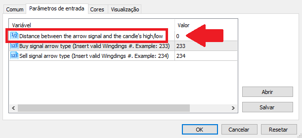 Der Standard ist Null für "Abstand zwischen dem Pfeilsignal und dem Hoch / Tief der Kerze". Sie können ihn jedoch auf der Registerkarte "Parameter" in einen beliebigen Wert ändern, der am besten zu Ihrem Stil passt.