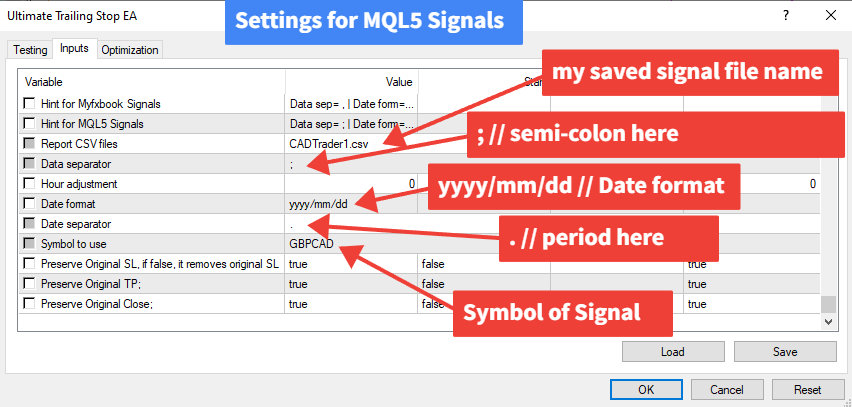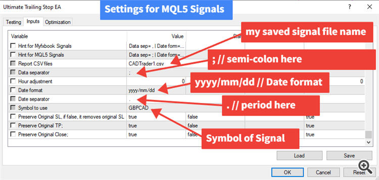 When I have UTS loaded up in the strategy tester on the signal symbol I am tested with, I put in the following settings: