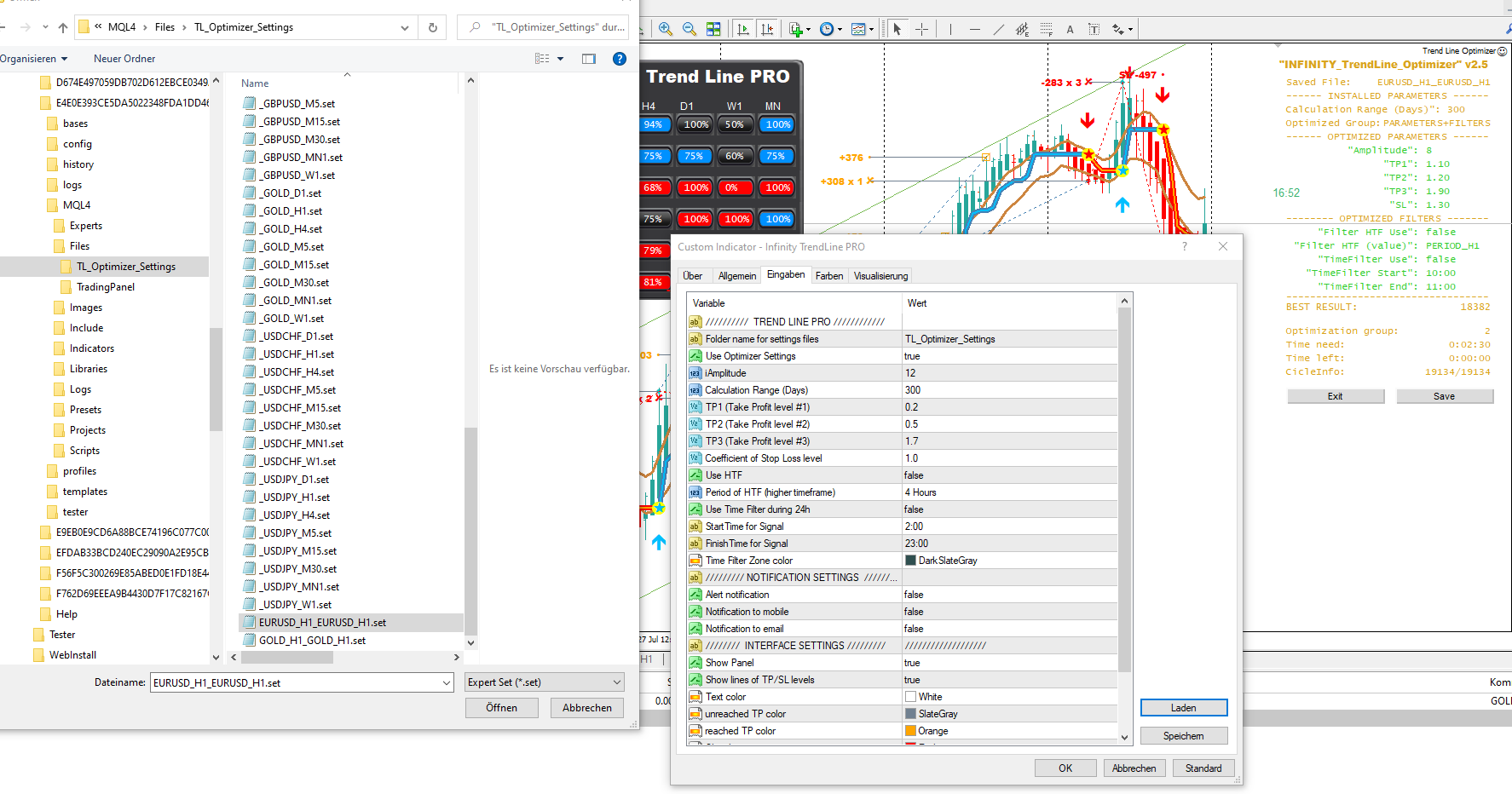 Wenn ich die Datei aus MQL\Files\TL_Optimizer_Settings\EURUSD_H1 optimiere und lade, ändert sich in Trend Line Pro nichts. Was mache ich falsch??