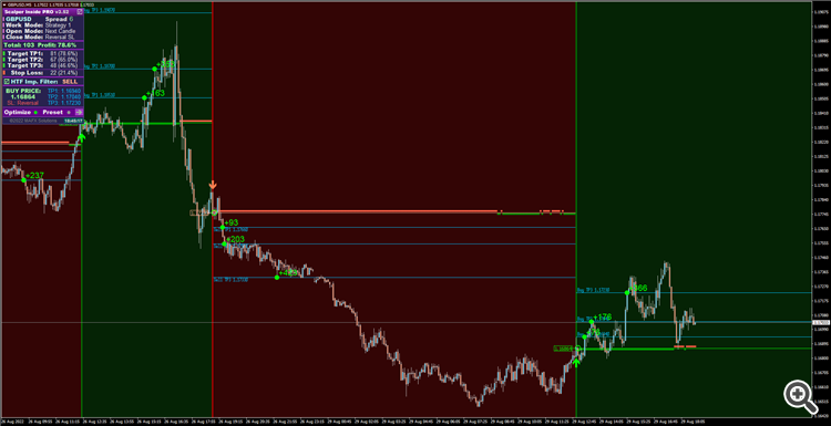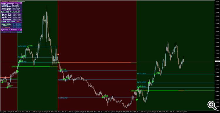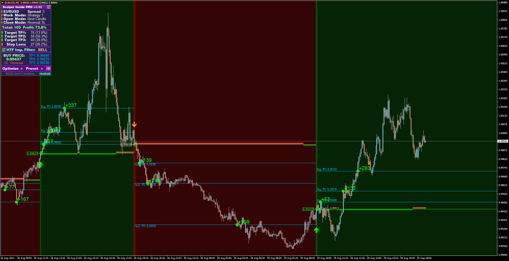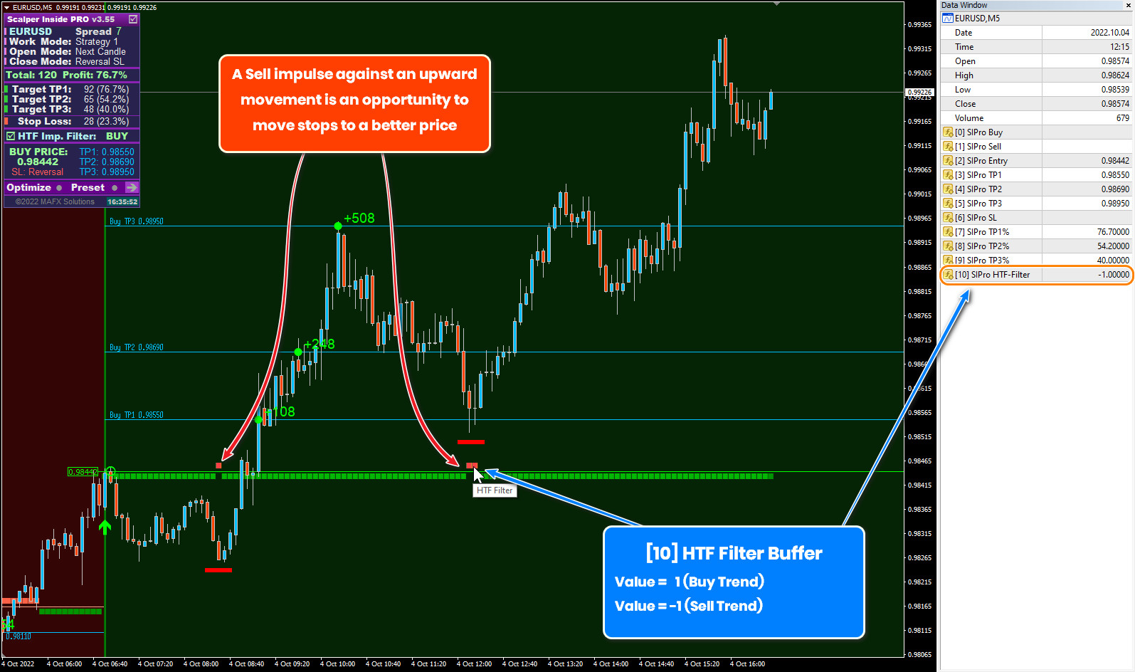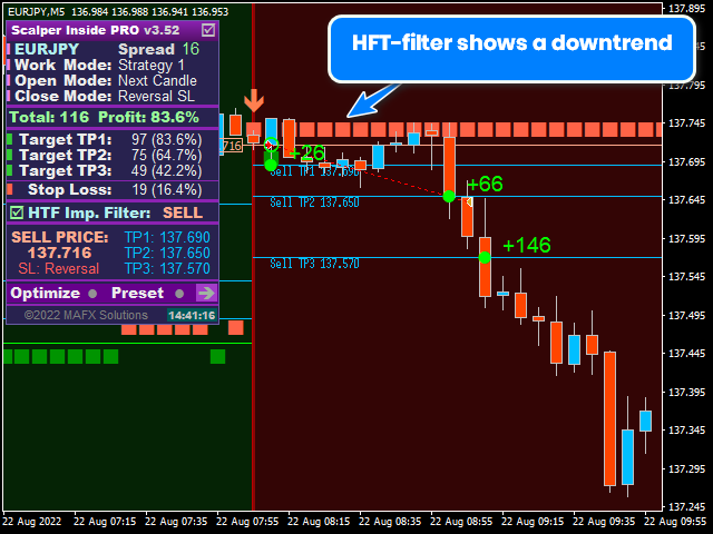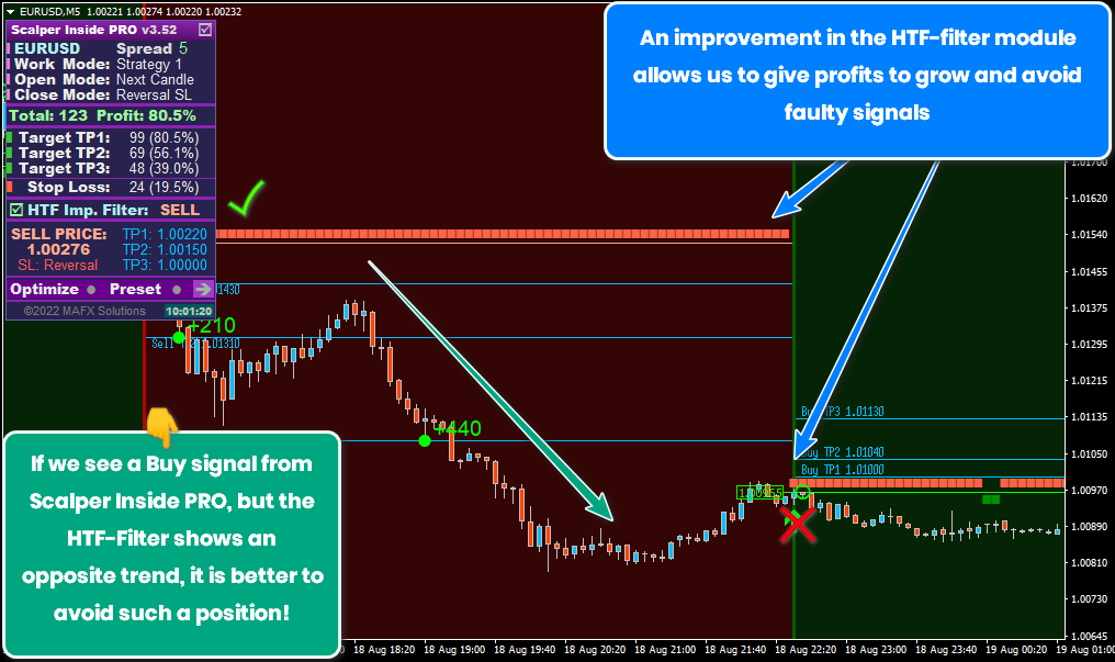 If we see a Buy signal from Scalper Inside PRO, but the HTF-Filter shows an opposite trend, it is better to avoid such a position!