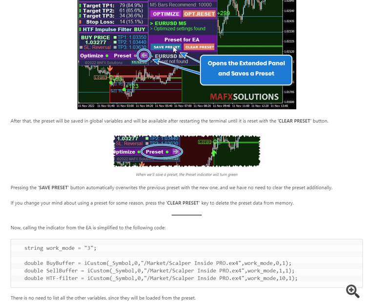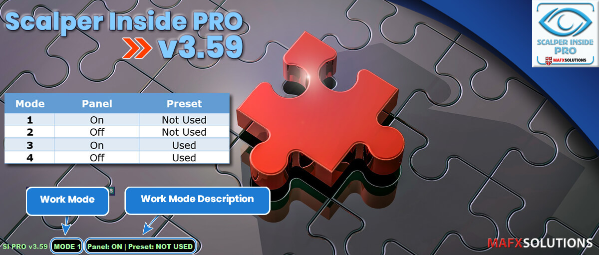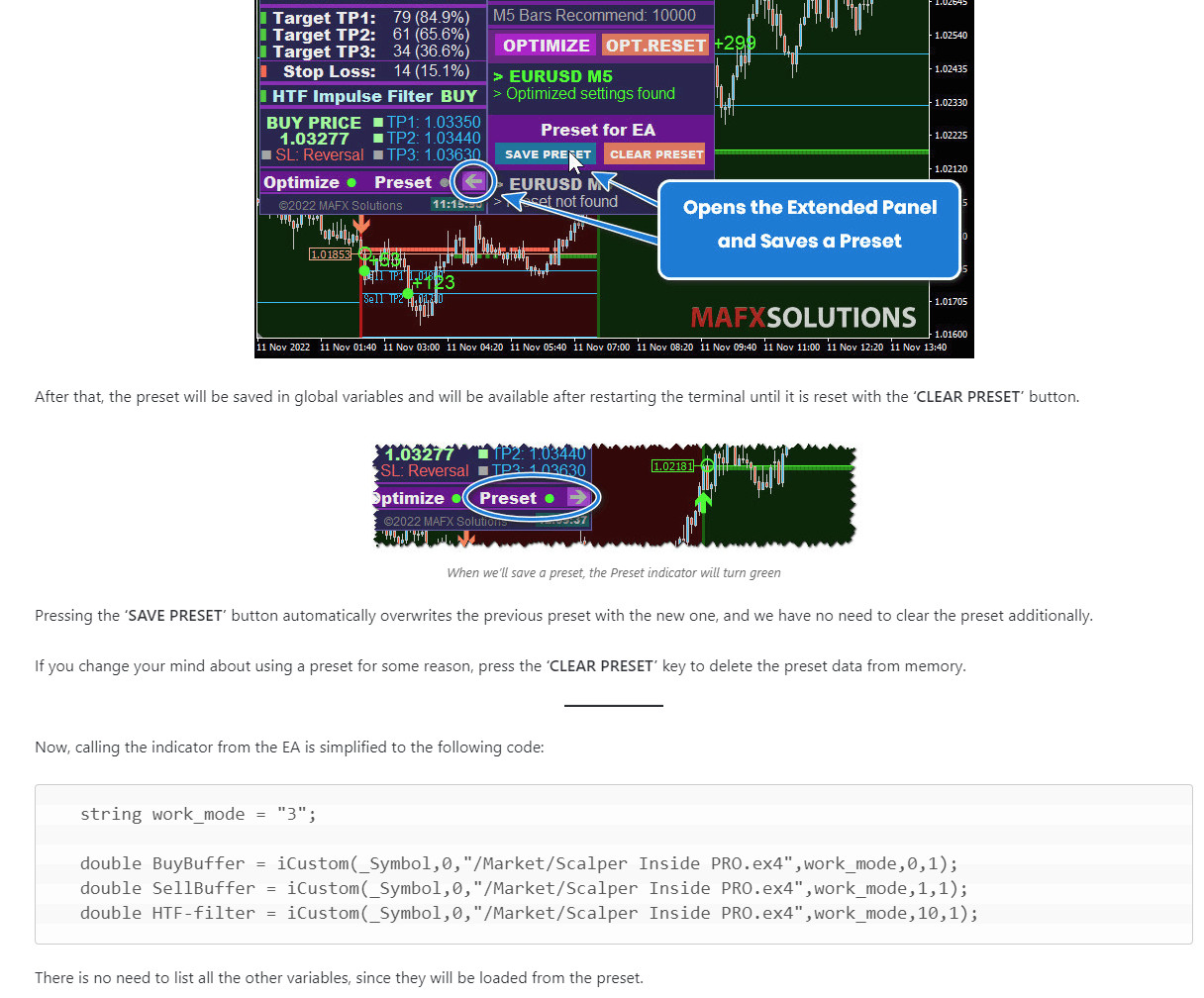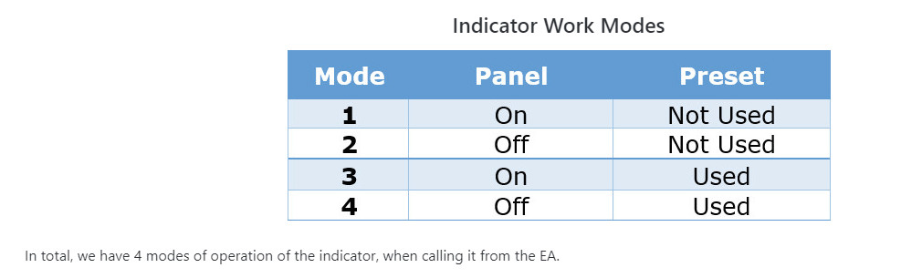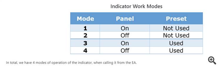In mode 2, the indicator panel is disabled so that you can configure your own panel from your EA and the panels data does not conflict. In this mode, the preset is also not used:
