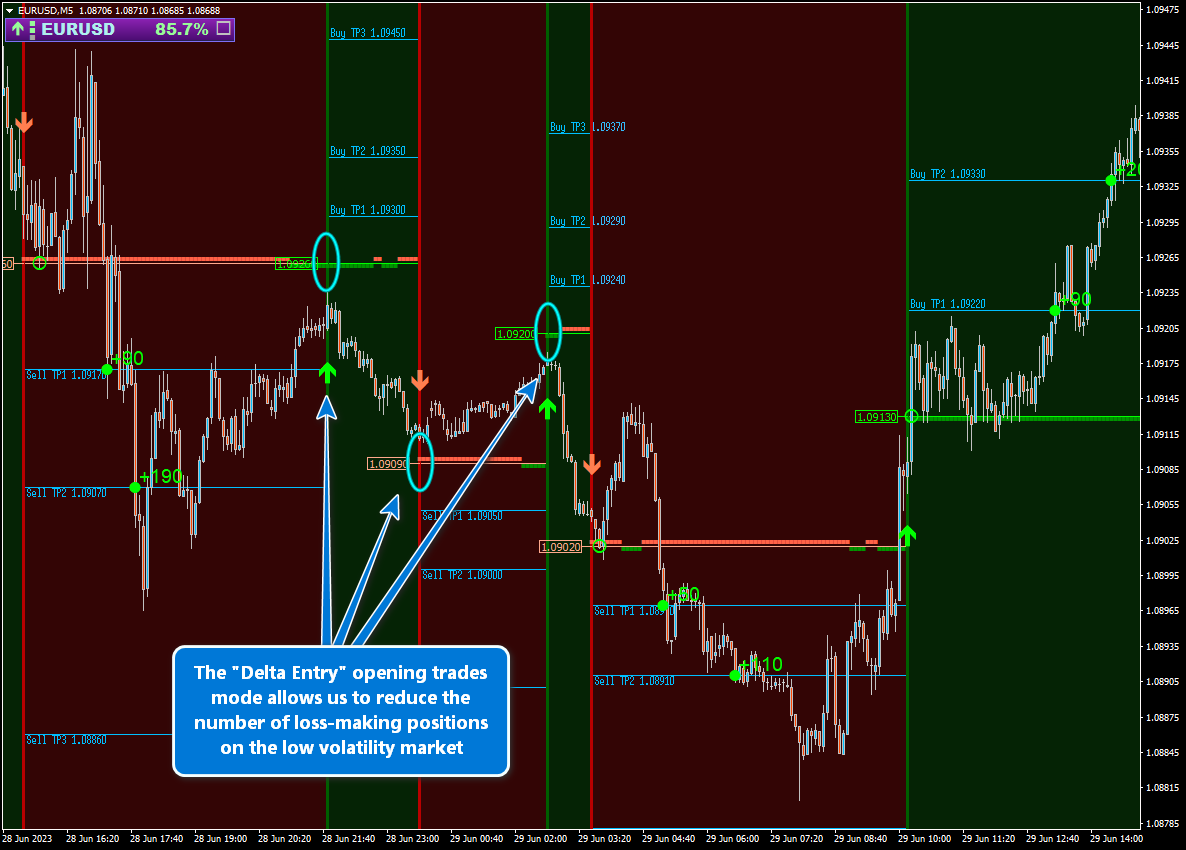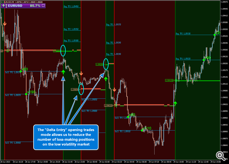 The "Delta Entry" opening trades mode allows us to reduce the number of loss-making positions on the low volatility market.