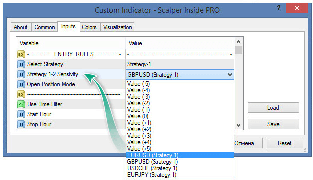 To make a long story short, I'm comfortable with the default settings in most cases. Also, in the indicator settings, you can find the 'Strategy 1-2 Sensitivity' option where you can see the presets for the major currency pairs:
