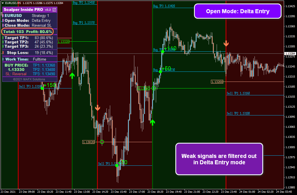Delta Entry is an excellent way to filter out false breakouts and avoid unsuccessful position openings. It works best in a not very active market or low- and medium-volatility trading instruments. Its main weakness becomes evident in the active trend market or very volatile instruments - we filter positions, but we can miss good ones or lose some profits because of it.