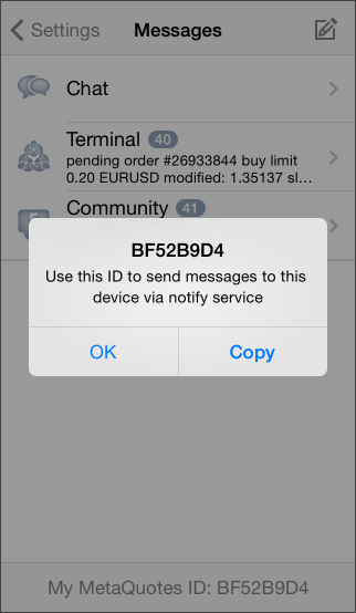 To find your MetaQuotes ID, open your mobile terminal and go to Settings -> Messages. This page in the terminal for iPhone looks as follows: