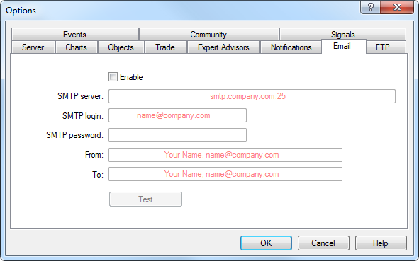 Привет. Настройки е-майл производятся непосредственно в настройках терминале MetaTrader.