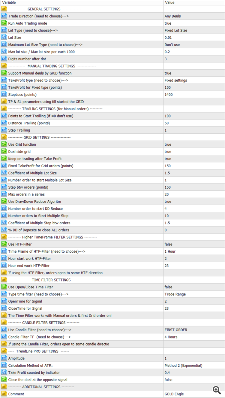 2. Changed the formula for calculating the Auto Lot Size parameter. The lot size calculated for every 1000 Balance of account. E.g. If you have $5000, the 1st order will open 0.5 (or if you set the Fixed Lot Size =0.5)