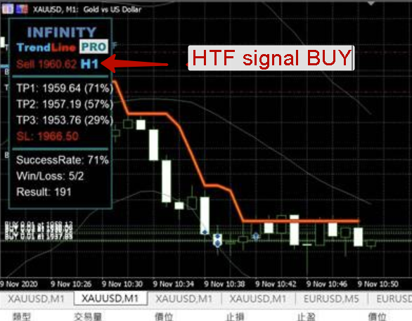 Hello. If you has set the HTF Filper=true you only get orders match with Higher TimeFrame signals