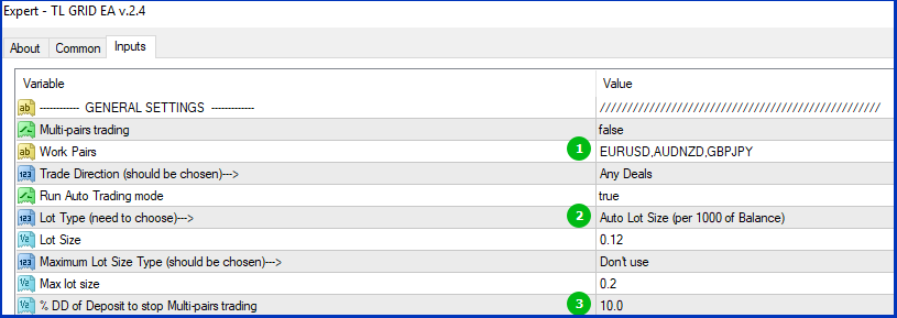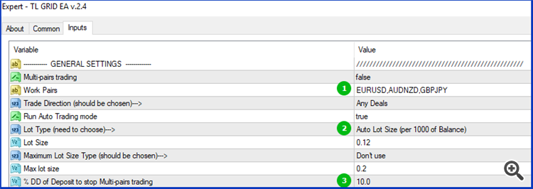 3.% DD of Deposit to stop Multi-pairs trading parameter to stop opening new orders while one of the pairs has DD>10% of Deposit (excluding one pair with the largest drawdown)