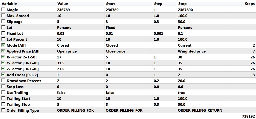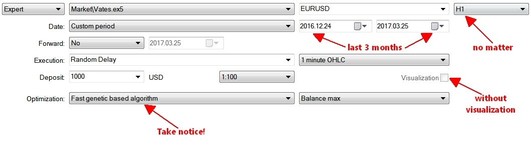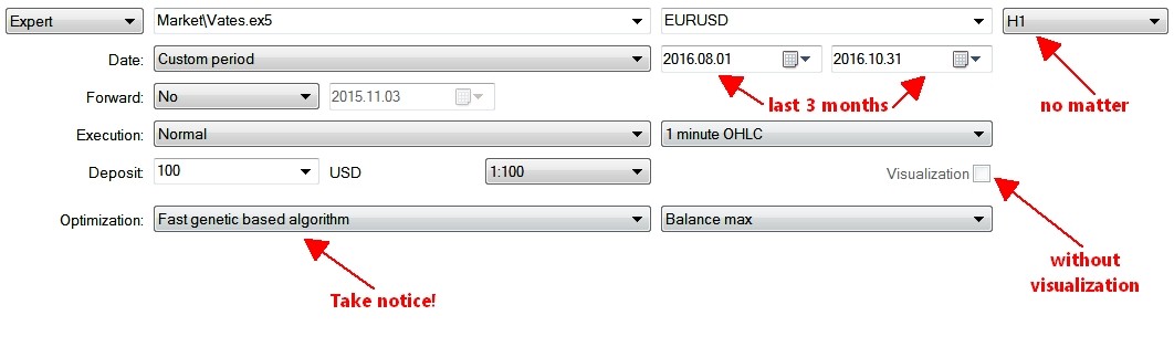 In order to choose the best settings, you must independently do the test for last 3 months with different pairs in the terminal of your broker and approximately with such settings (see the attached images).
