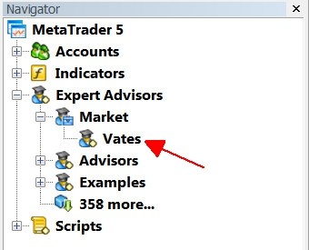 После скачивания триал версии файл Vates.ex5 должен оказаться в папке C/Program Files/MetaTrader 5/MQL5/Experts/Market и, конечно же, в самом терминале (см. приложенное фото vates.jpg).