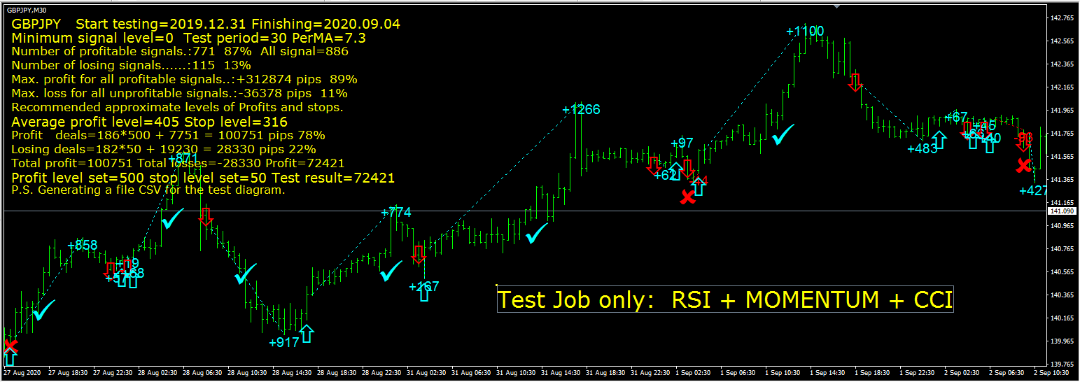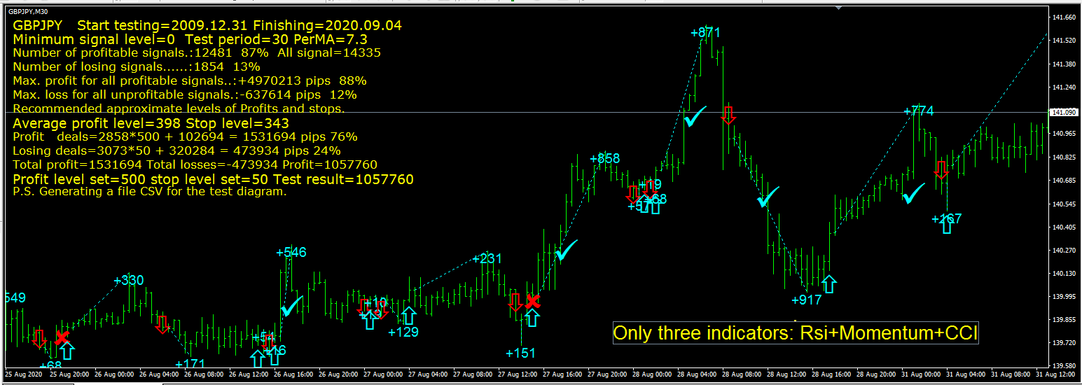 Запустил такой тест: в расчете сигнала только три стандартных индикатора, Rsi + Momentum + CCI остальные отключены.