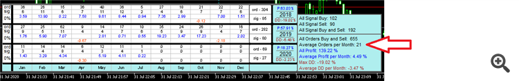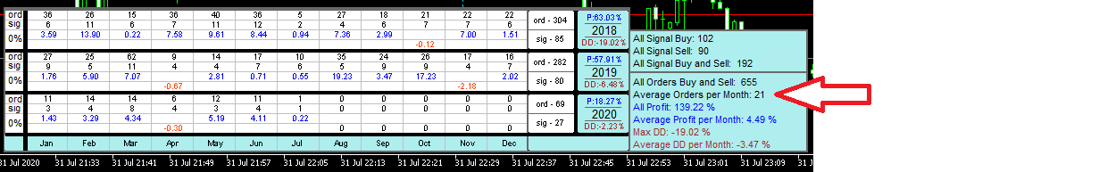 Pairs and timeframeThe Advisor opens has low trading activity and opens up to 50 orders per month.