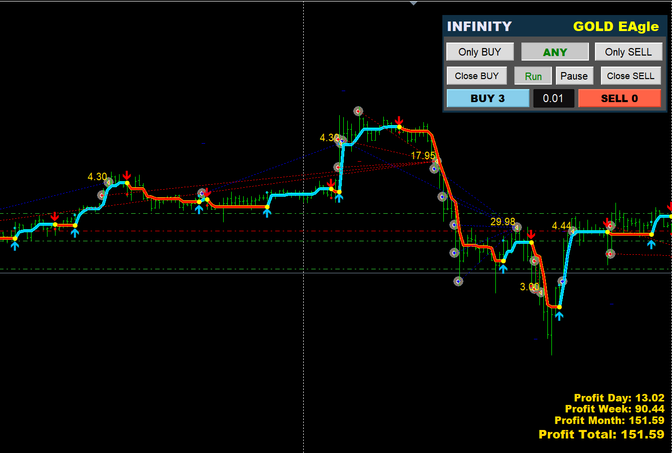 RUN and Pause buttons enable and disable auto trading.