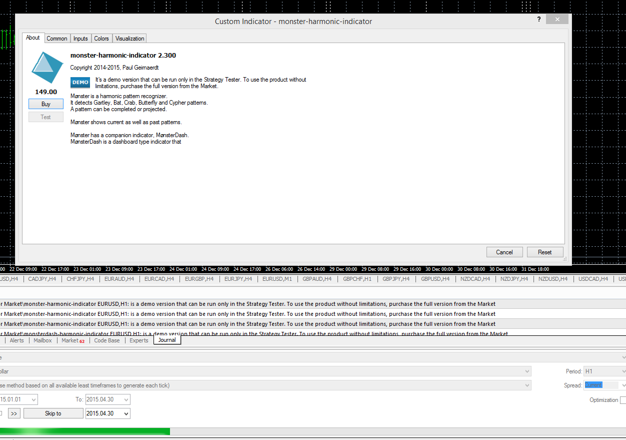 Hi Paul - I'm trying to demo your Monster Indicator in the Strategy Tester but the 'Test' button never gets enabled. See image below. Maybe include instructions in the Overview area? Thanks Bill
