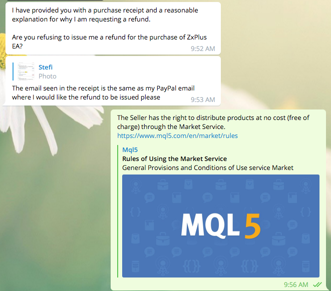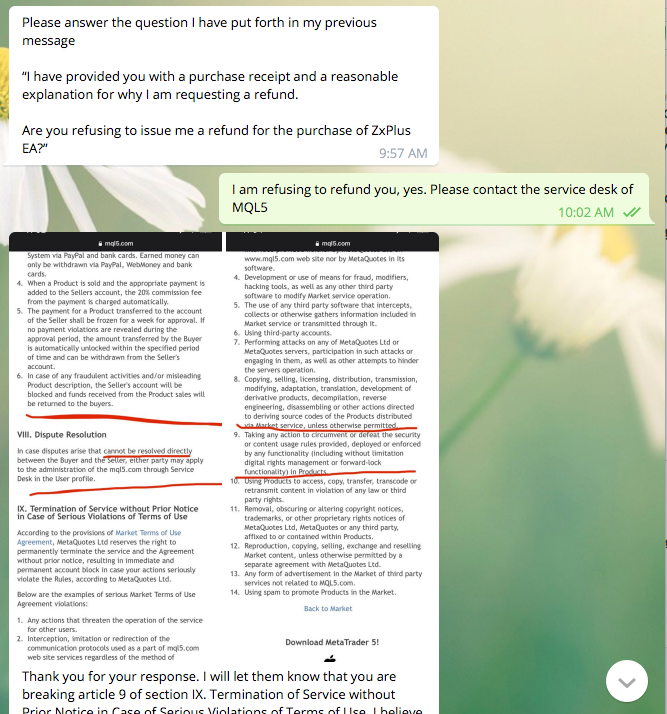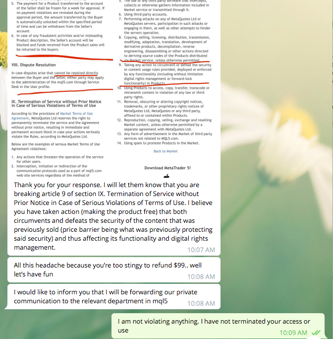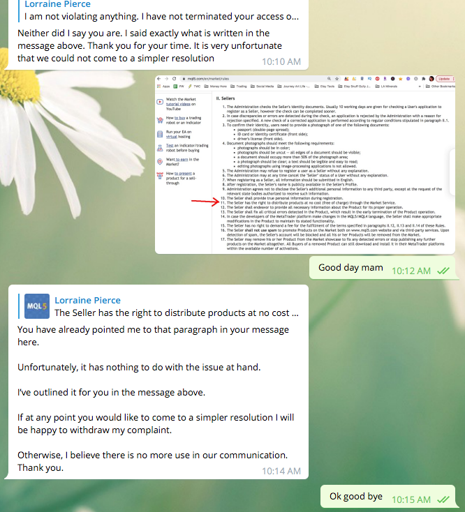 Upon reaching out to the author in regards to this issue I was met with nothing but rudeness. Screenshot attached. I have launched a formal complaint with mql5 regarding this as I believe she is in violation of article 9 of section IX. Termination of Service without Prior Notice in Case of Serious Violations of Terms of Use. I believe she has taken action (making the product free) that both circumvents and defeats the security of the content that was previously sold (price barrier being what was previously protecting said security) and thus affecting its functionality and digital rights management.