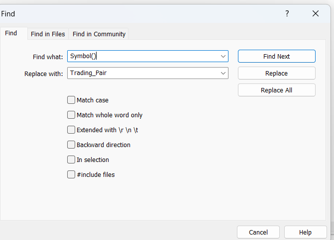 In the Replace tab: Type the string input Trading_Pair.
