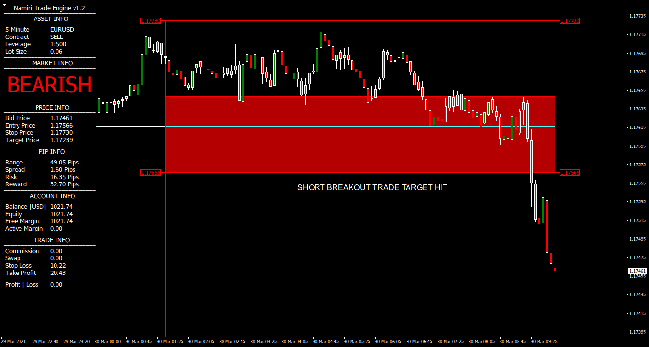 I took a High Probability Potential SHORT Breakout Trade on the EURUSD M5, stop loss set, target set for a 1:2 risk:reward ratio.