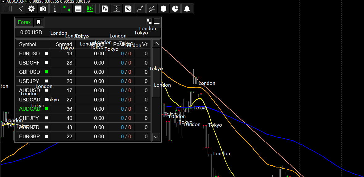 For the option of displaying the Forex Market Hours in main window(chart window) I suggest that the Line and Text object be set as background so it will not overwrite other panel such as trade panel as shown below.