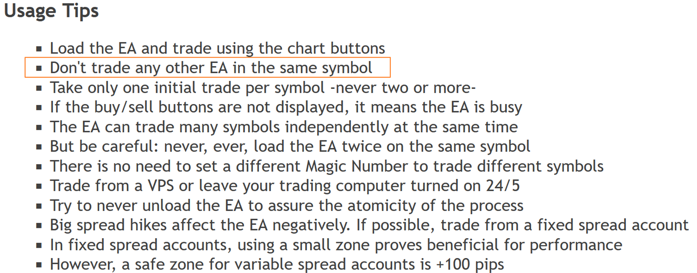 Usage Tips of many of your EAs suggest that "Don't trade any other EA in the same symbol".