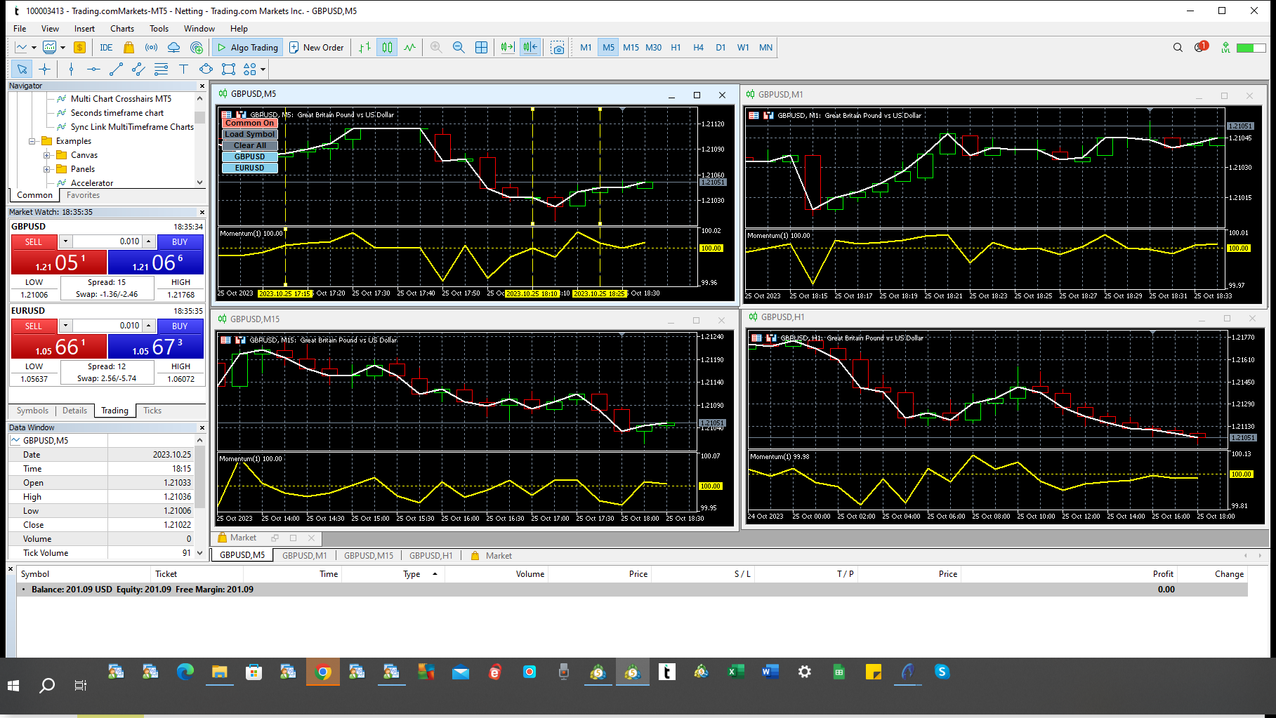 screen shot #1: Set up for GBPUSD with 5 min chart as controlling chart.