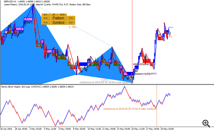 In version 7.7, Harmonic Pattern Scenario Planner can detect pattern using Renko Brick calulation. This is equivalent to detect pattern over the dedicated Renko Chart (Imagine that you have opened Renko Chart and then put this indicator over the Renko Chart). So it is very powerful due to less noise in the Renko Chart. The good news is that you don't need a dedicated Renko Chart as this indicators does renko brick calculation at the background using Smart Renko Indicator. So you are hassle free but this indicators will does a lot of work for you.