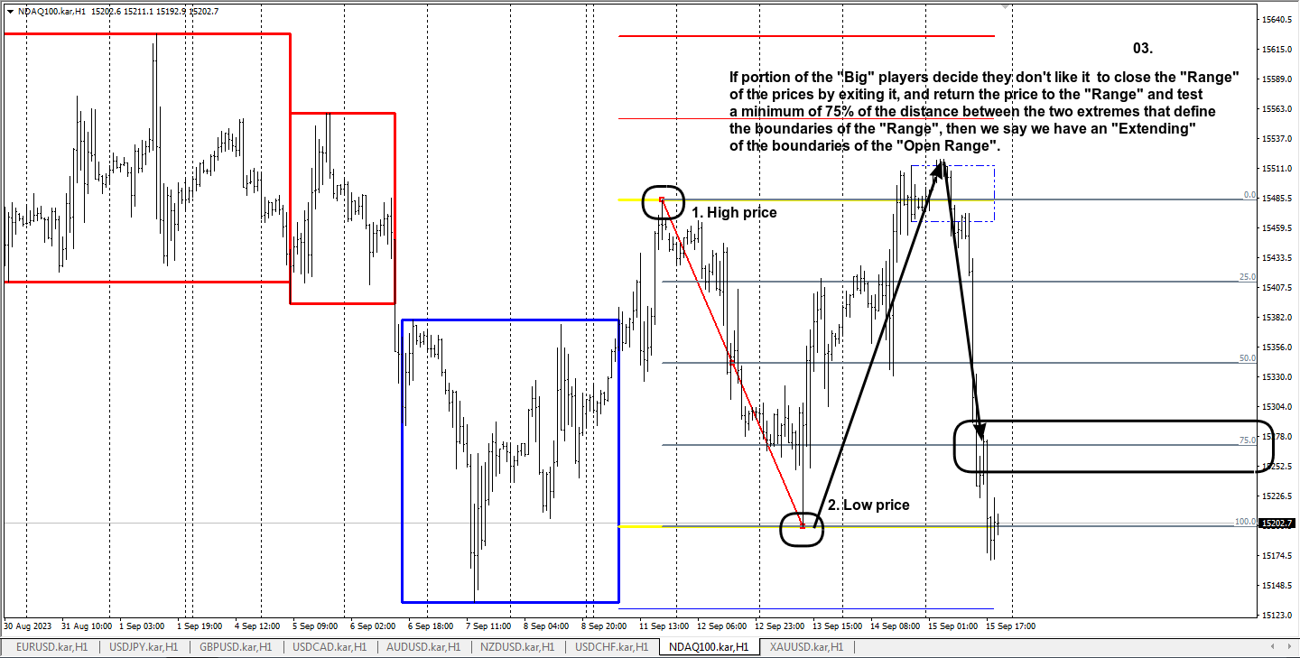 2. If portion of the "Big" players decide they don't like it to close the "Range" of the prices by exiting it, return the price to the "Range" and test a minimum of 75% of the distance between the two extremes that define the boundaries of the "Range", then we say we have an "Extending" of the boundaries of the "Open Range". See screenshot 3.