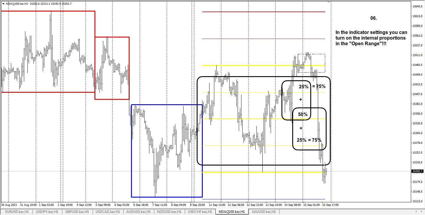 In the indicator settings you can turn on the internal proportions in the "Open Range" to help you understand what is happening in the ranges. See screenshots 5 and 6.