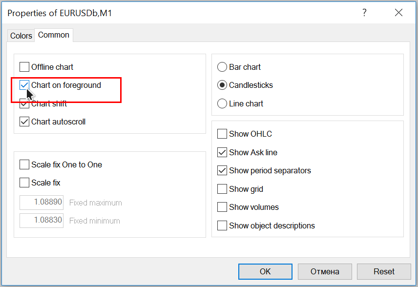 Чтобы уровни не закрывали график, в свойствах графика установите флажок "График на переднем плане", как на картинке.