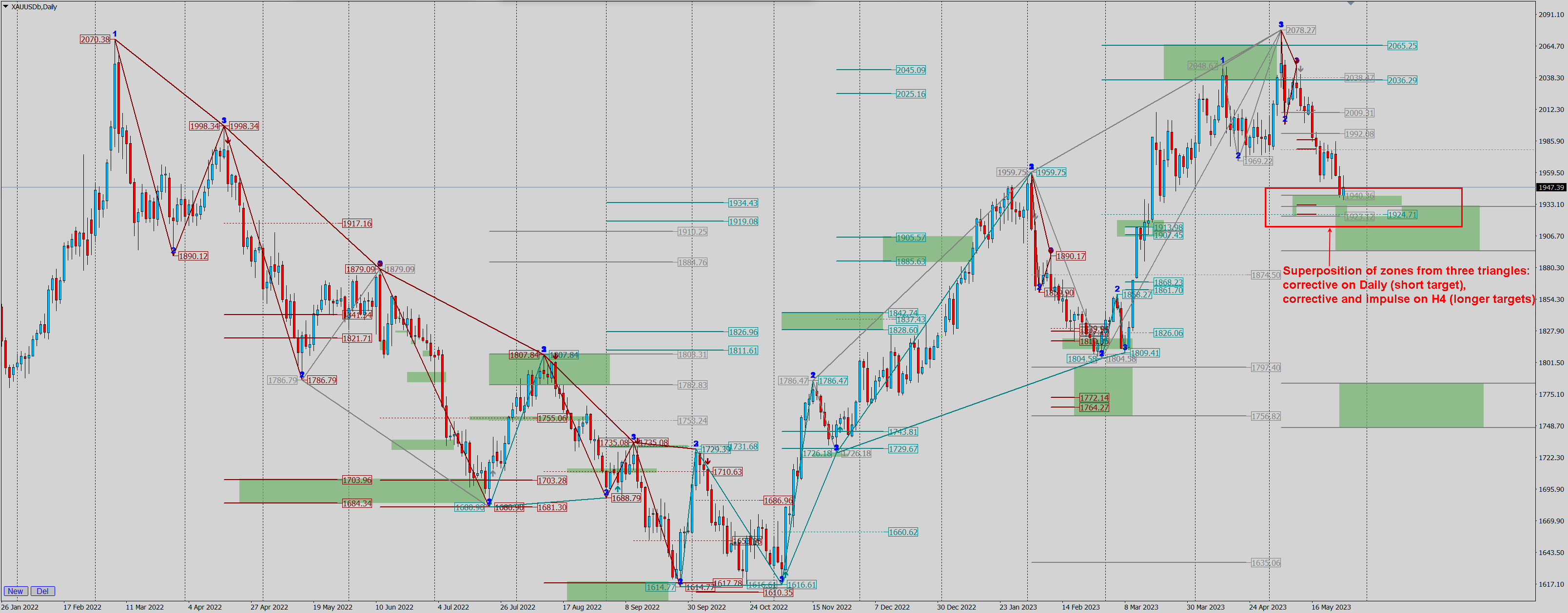 Look at this chart of gold, where I mark the strategic targets from the Daily and H4 timeframes. There are impulse and corrective triangles. As you can see, points 1 and 2 will not always be on the zigzag points.