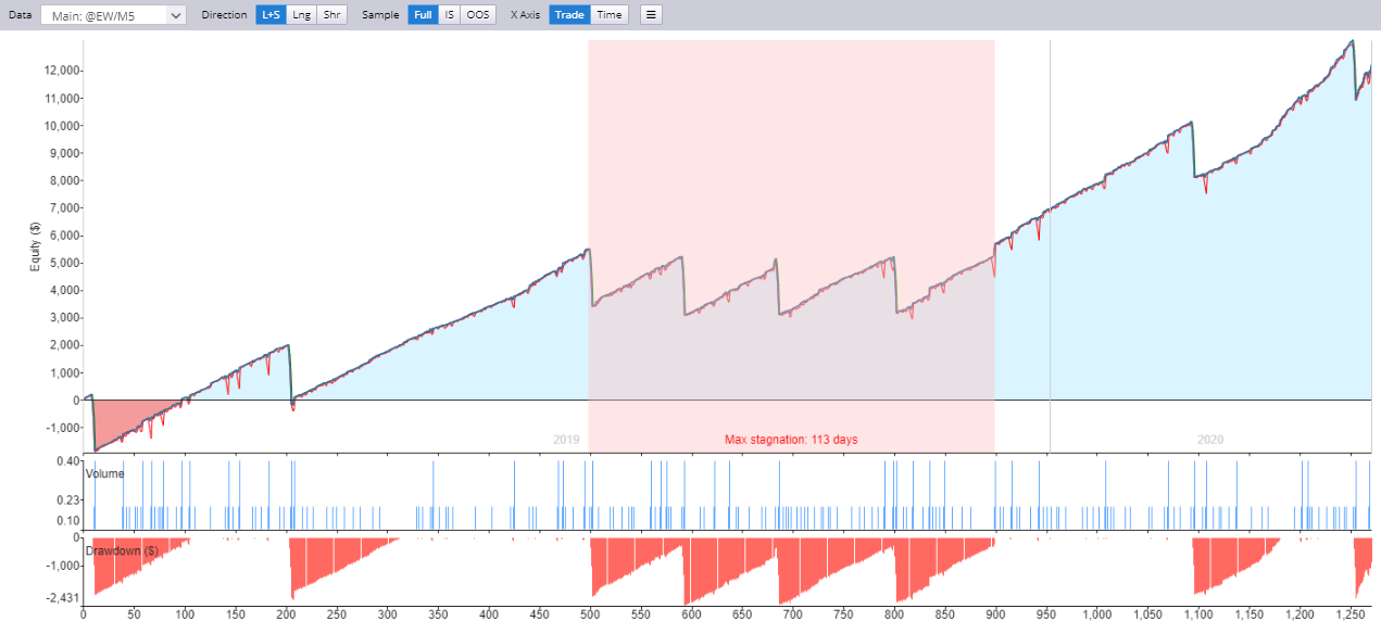 Результат тестов стратегии в AlgoWizard на символе @EW (Edwards Stock) с периодом M5 /пять минут/ и точностью М1 /одна минута/ за 2019-2020 год.