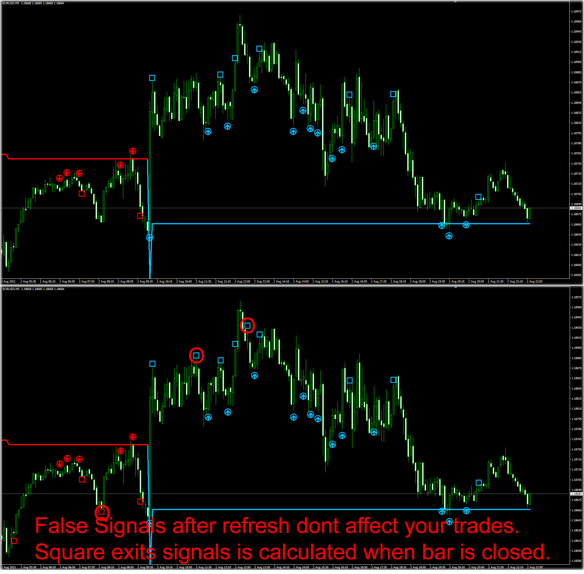 If you refresh or change settings indicator you can see more exits signals repainted, but main exit signal, the first square exit signal after arrow signal never must repaints. The other exit square false signals are useless and must not affect your trades.