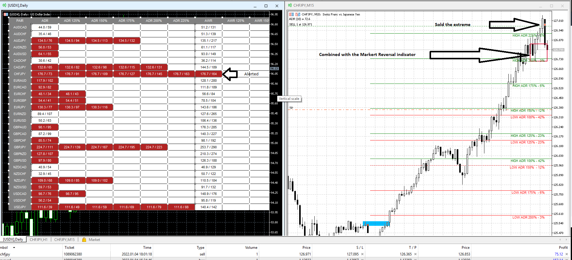 Just back up Mr Samson the great here is a present trade I took on 4/01/2022 CHF/JPY just after purchasing and watched the explanation videos for innerstanding . The image on the left is a combination of the ADR dashboard and the Markert reversal indicator and the ADR Levels. 5 stars for all three , worth every single penny , it might even be under Priced, so extra thumbs up to Mr Lee Samson for making it affordable for all. God bless you.