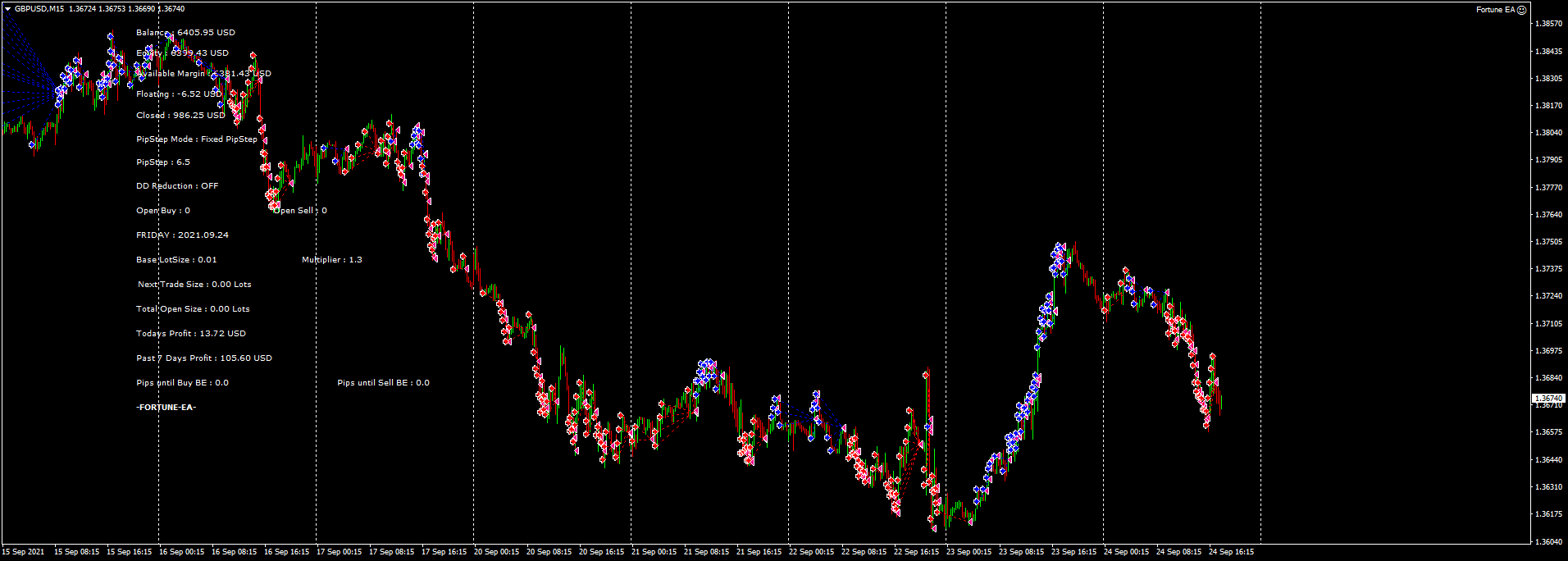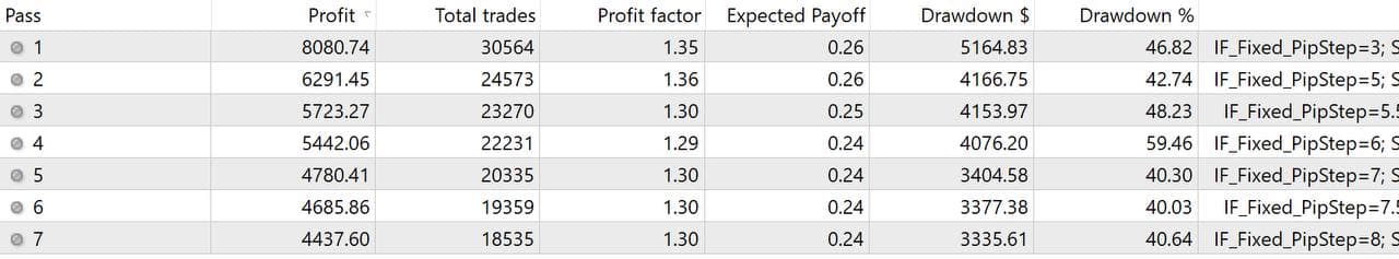 Fortune EA, GBPUSD Jan2020 - Sep2021, 15M timeframe, optimisation results testing different pipstep inputs from 2.5 - 8 in increments of 0.5.