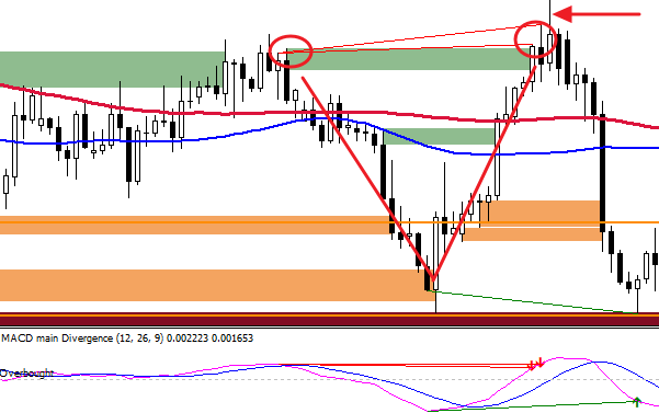 Divergences which occur at such levels are very strong setups. The screenshot below shows a strict (sharp) V formation which I typically trade when there is a MACD divergence followed by some kind of indecision/rejection formation. In this case a pin bar. I take the trade when a regular (classical) divergence occurs at such a zone and price is showing signs of stalling and for instance the ADX indicator has a value below 30. A good sign is if there is a double divergence and/or a divergence which has been repeated on the last 2 candles (for this you will need to use Candle shift 0). I set stop loss under/over the outer zone border with a 8% ADR (average daily range) offset. We can take the example that a pair has a 20 day ADR of around 100 pips. 8% of that is 8 pips. I set take profit according to my own analysis.