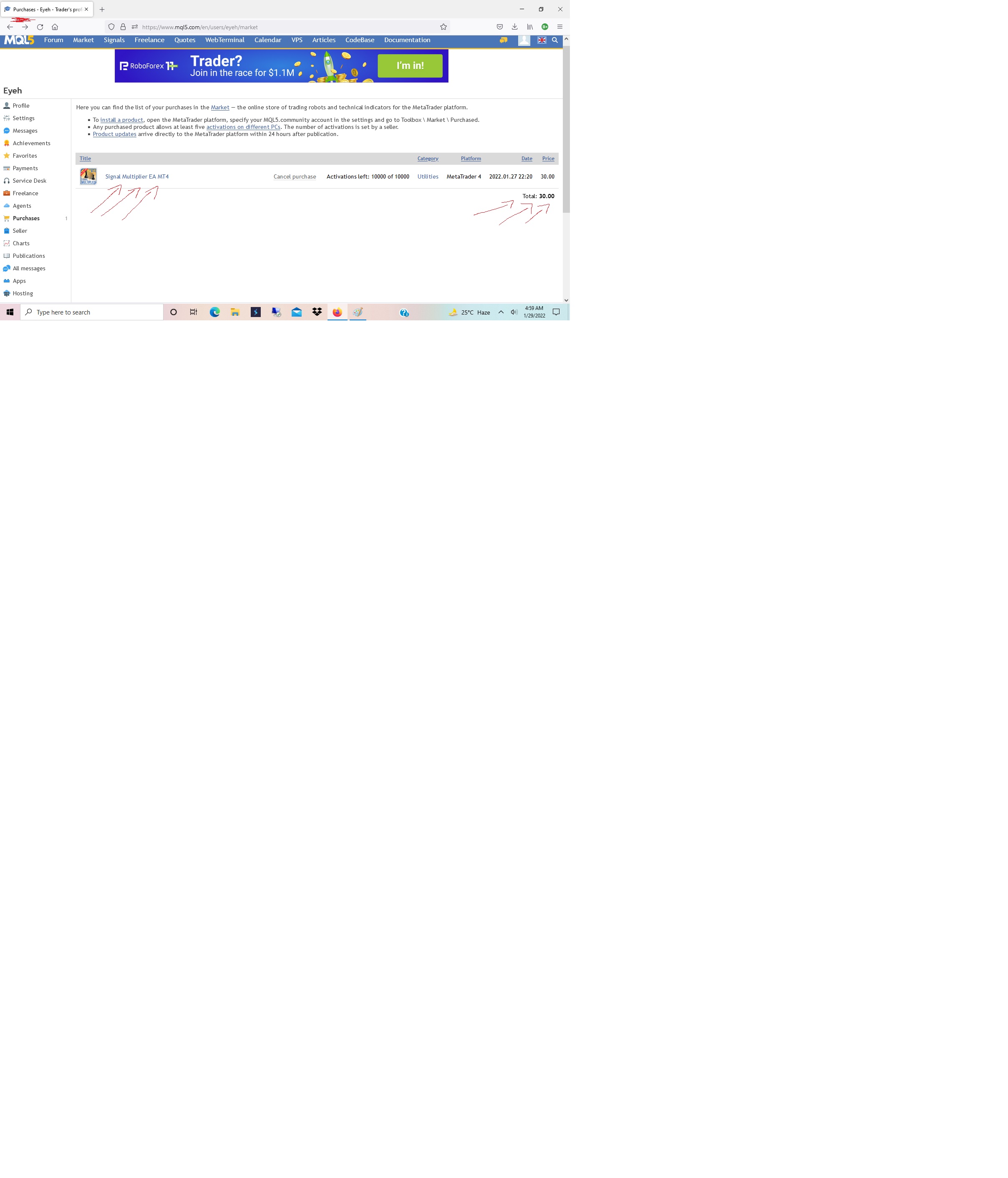 I purchased your Signal Multiplier EA. I was debited and I clicked on "Install on the terminal". But I can't find the downloaded file on my MT4 platform, and so am unable to install the EA. Rather, I see on my MT4, a place to click "Buy now", which means my account would likely be debited twice if I click on 'buy now'. My question is, why can't I find the downloaded file? Or was it downloaded to an older MQL5 account that I may have forgotten about? Please, help in any way you can.