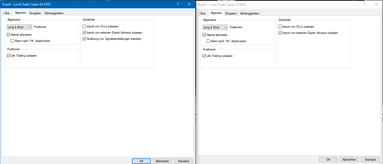 Hi Eleni, I can't activate allow modification of signals setting in the receiver input because there is no input window or field for it. The receiver is with the broker roboforex. Since I have different symbols from the sender, I have to be able to activate it. I tried it anyway but it doesn't copy! What is the solution to this? Thank you for the quick answer. See screenshot, in the right picture there is no option to allow the changes