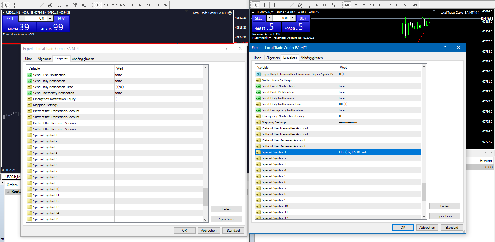 Hi Eleni, thank you very much for your help!!!I have wached your video at least 4 times and also your instructions. I have tried out all sorts of different setting. It works with EURUSD. But I urgently need the US30 from the broker eightcap to roboforex. You can find my latest settings in the attachement. You can also see the markets symbol at the top. On the left is eightcap as the sender on the right roboforex as the receiver. I would be very grateful if you could find out on your demo account how to set it up correctly so that the US30 can be copied and if you could send me a similar screen that I can use with your correct working details! Thank you very much for your help! I'm away for a few hours, but I will look at your answer as soon as I get home. Thank you