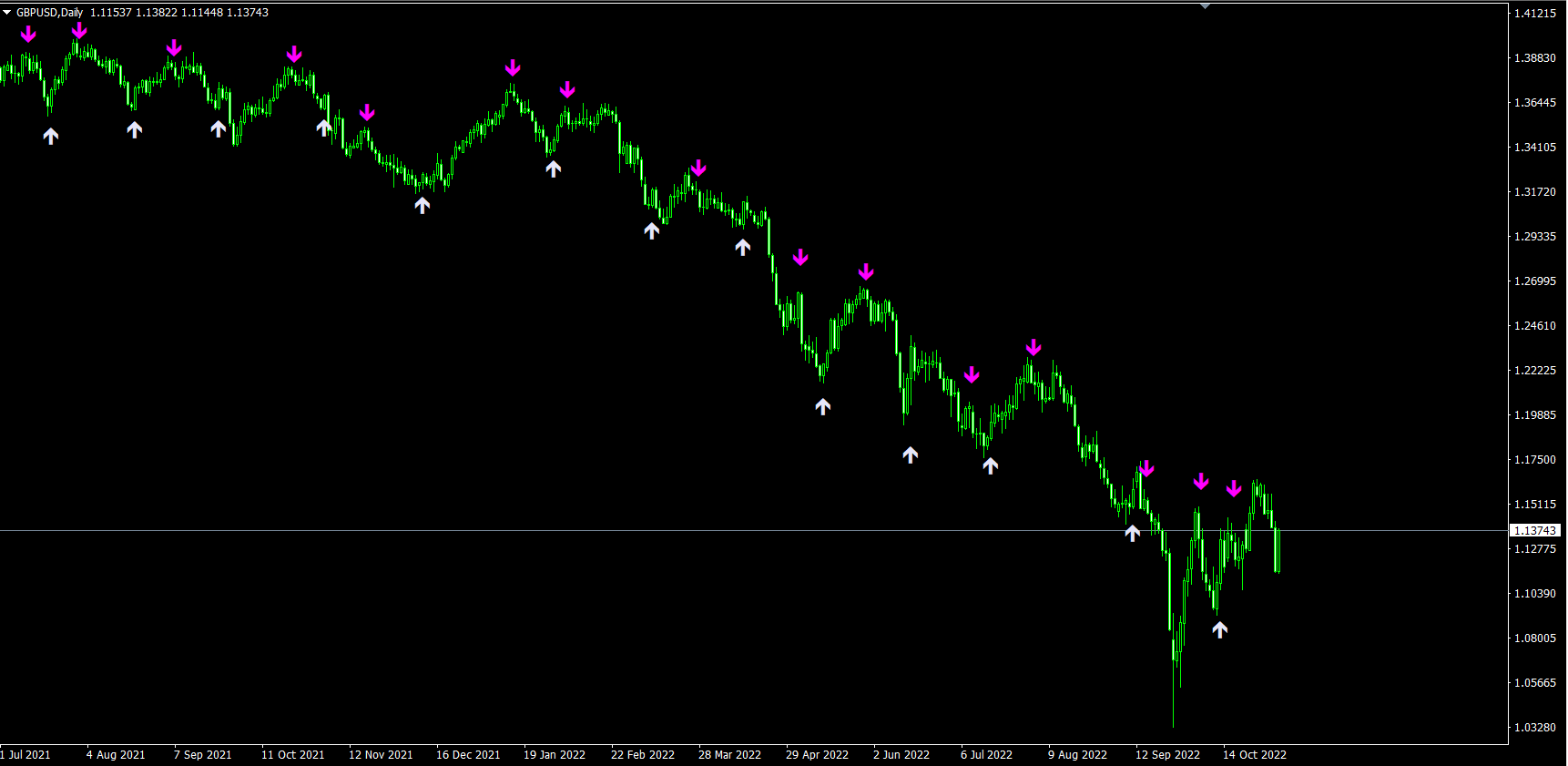 These are the signals on the GBPUSD D1 chart using default settings.