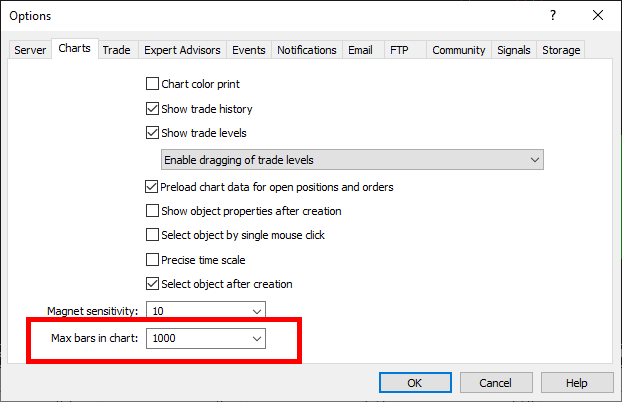 Important: It is strongly advised to put in MT4/5 >> Tools >> Options >> Chart >> Max Bars in Chart >> 1000 or a similar low number, because when Matrix Arrow Indicator MT4/5 is attached on a chart, calculates all 10 indicator's attributes over this number of bars/candles and if you have a large number there, like many thousands or millions, it will take more time to update each time and may make your MT4/5 terminal freeze on a slow computer.