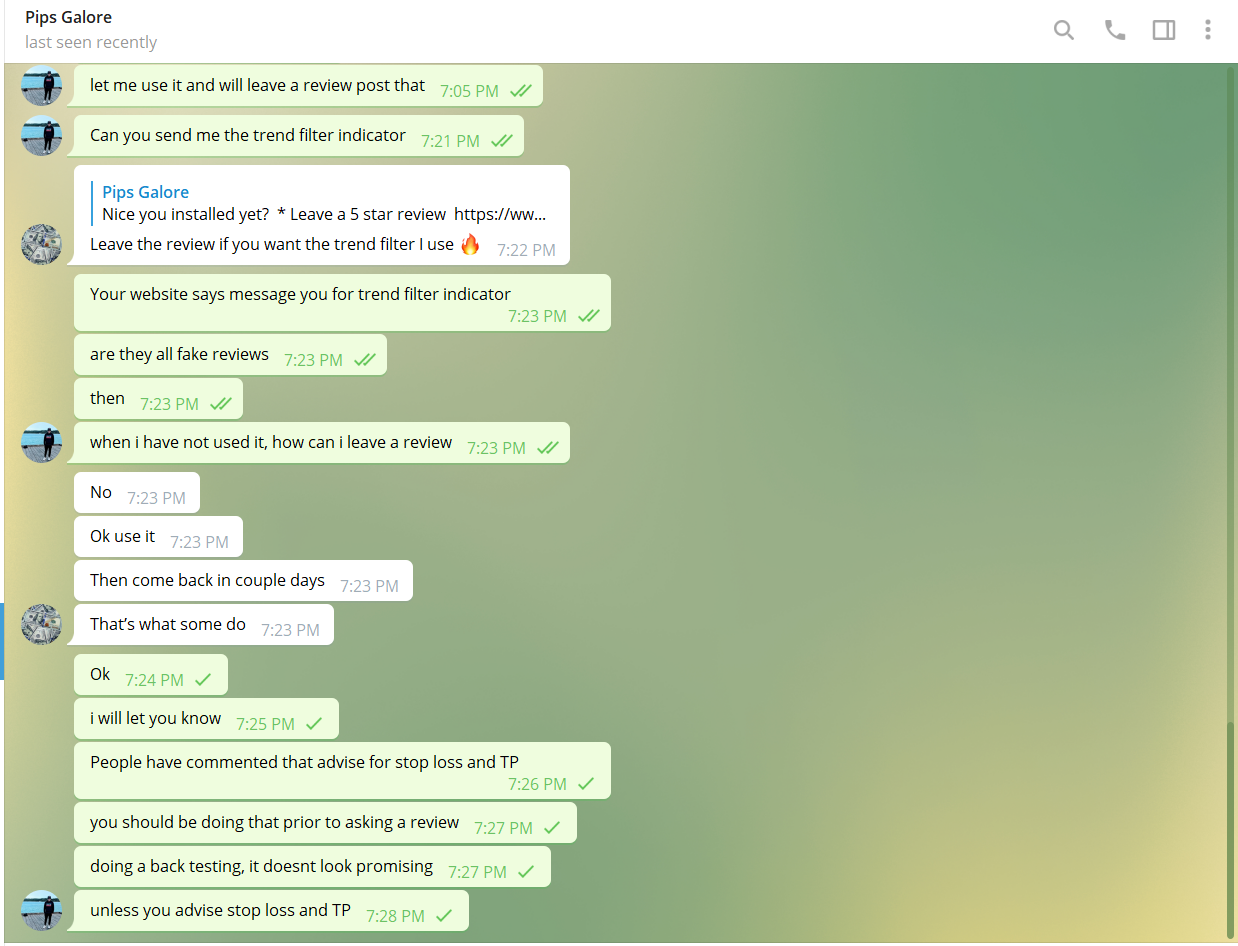 Buddy check the screenshot. This is your chat with me. Read what you have mentioned. Leave the review if you want trend filter indicator. Come out of this fake bulls**t which you show to people. I can vouch and say that majority of the reviews are fake. all have been forced to give you 5 stars hoping they get what is mentioned.
